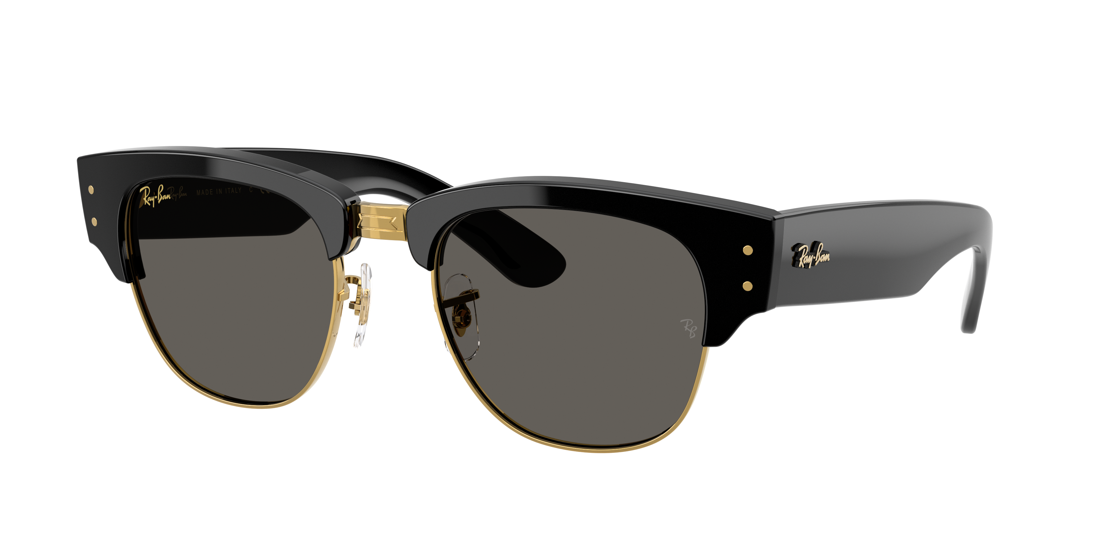 Experience the ideal blend of style and performance with Ray-Ban Mega Clubmaster. These square-shaped glasses feature a polished black on gold frame. The solid dark grey lenses provide excellent protection against the sun's harmful rays, while also reducing glare and enhancing contrast for a clearer vision. Embrace your individuality and stand out in a crowd with these iconic shades.