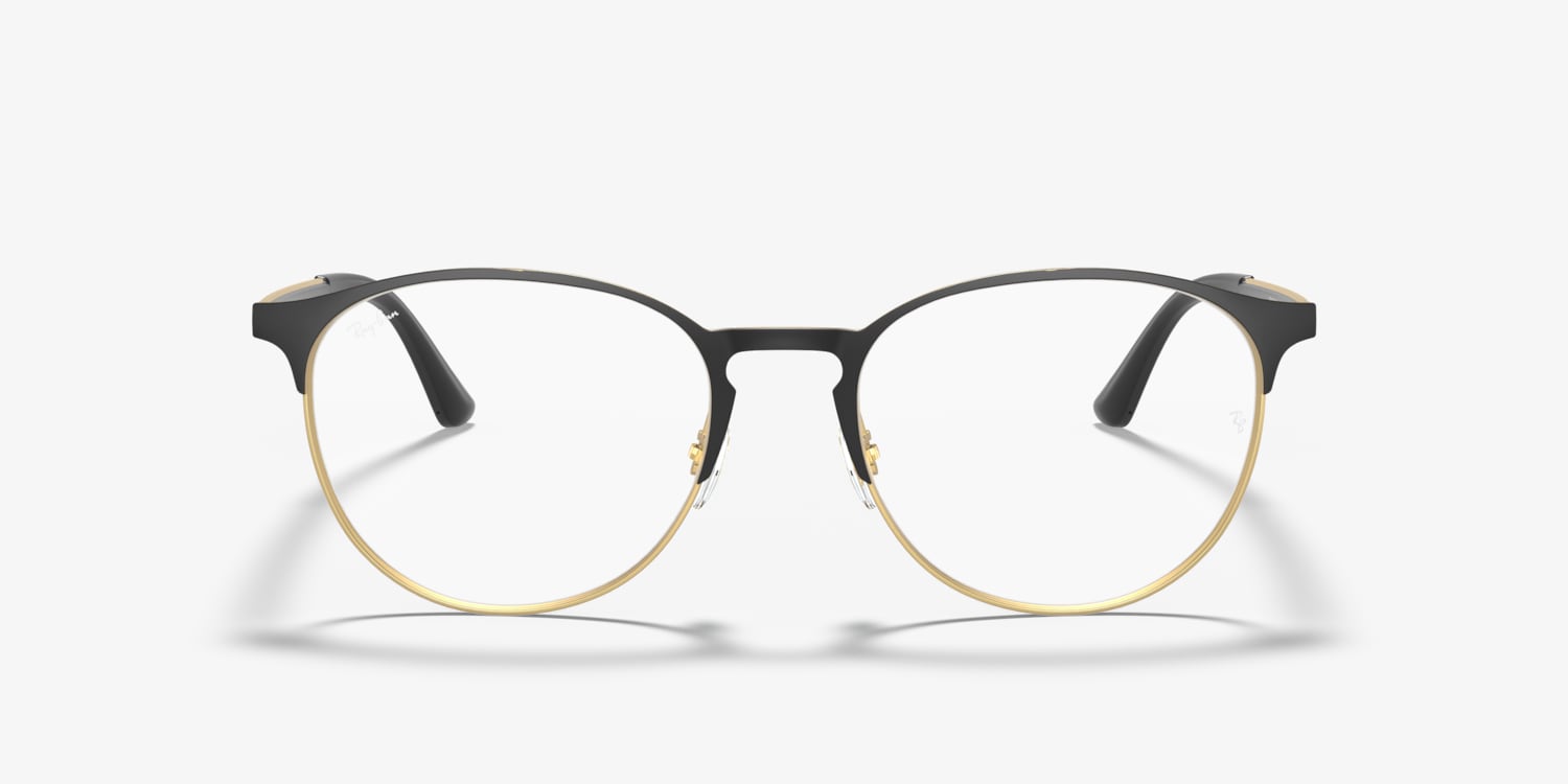Elevate your fashion and optical standards with Ray-Ban RB6375 Optics. The metal frame, in a striking matte black on gold finish, features a key bridge design that adds a unique touch to the phantos shape. Crafted with precision using durable materials, these glasses are designed for longevity. Embrace the timeless appeal of Ray-Ban and experience the perfect fusion of style and comfort. Available with prescription lenses.