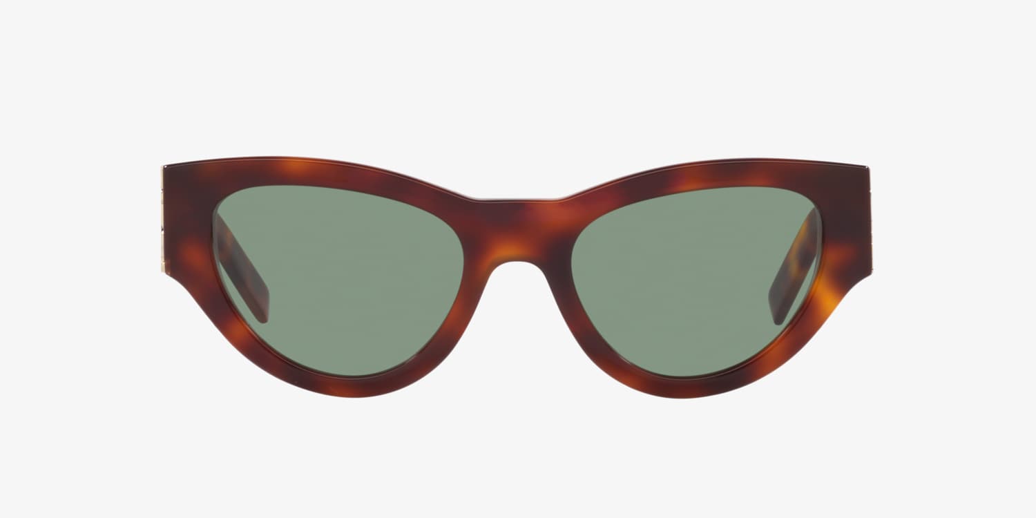 Elevate your style with the Saint Laurent SL M94 sunglasses. These full-rim, cat eye sunglasses in rich brown and tan exude timeless sophistication. Crafted from lightweight plastic with acetate temples, they offer a comfortable and durable fit. The solid green lenses add a bold contrast, delivering 100% UVA/UVB protection for sunny days.