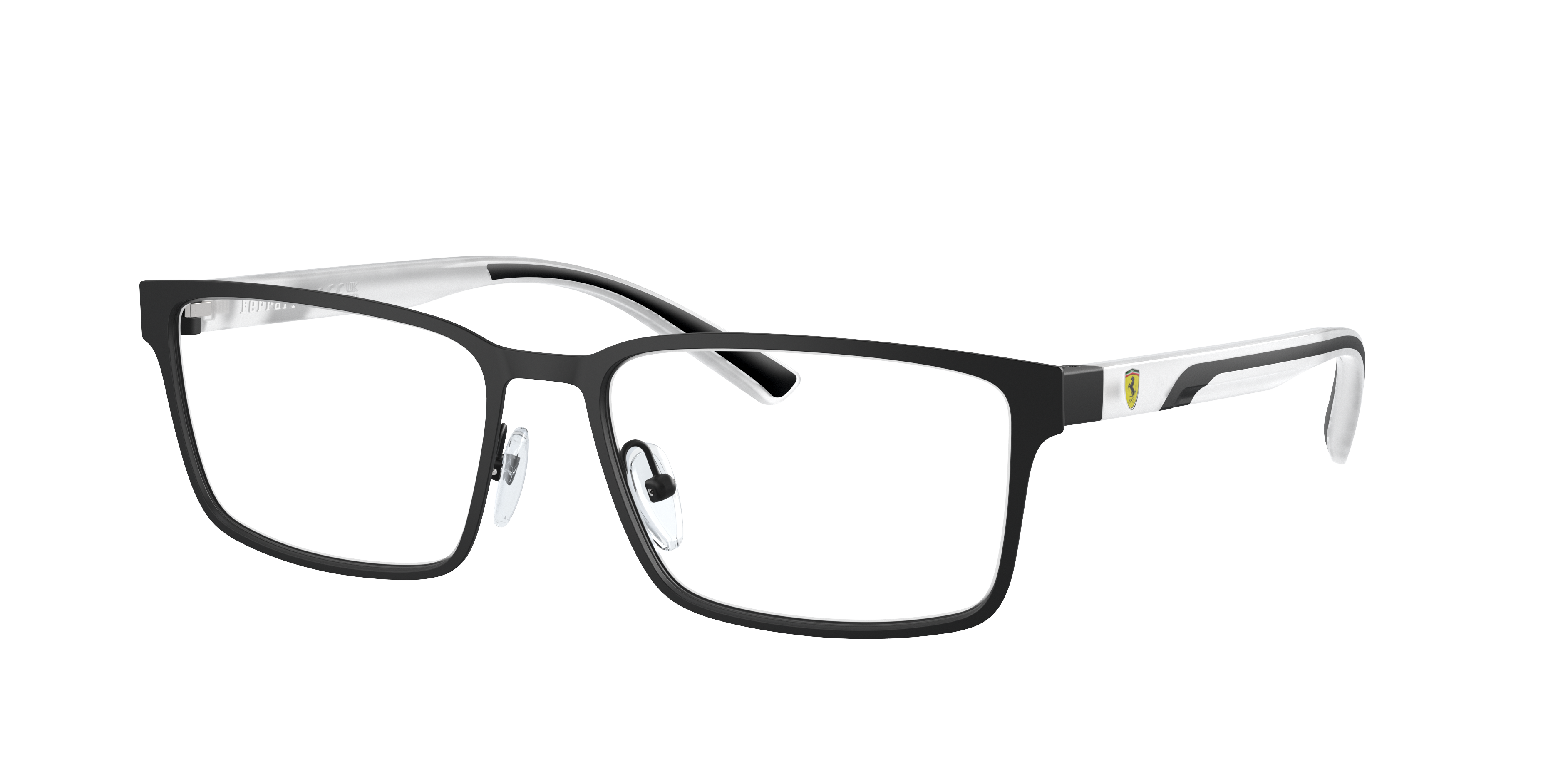 The Scuderia Ferrari FZ7002 optical glasses bring the thrill of racing to your everyday style. Crafted with lightweight metal frames, these rectangular glasses feature clean lines and a sleek shape for modern definition. The slim injected temples, inspired by racecar fenders, showcase the iconic Scuderia Ferrari shield logo. Finished with adjustable nose pads for a comfortable fit, these Scuderia Ferrari eyeglasses exude precision engineering. Designed to impress with black frames and clear lenses.