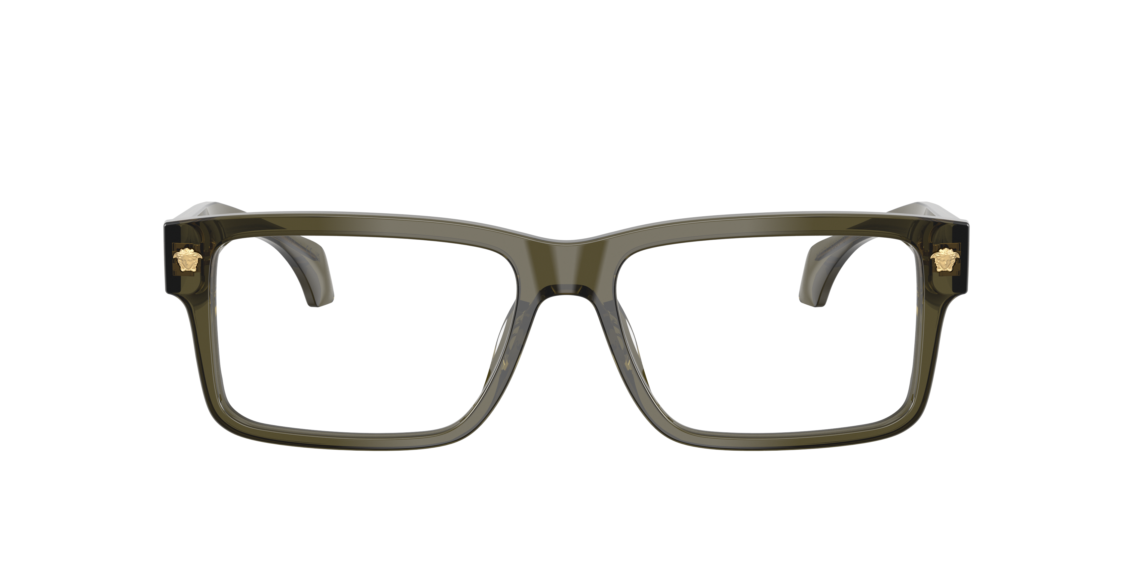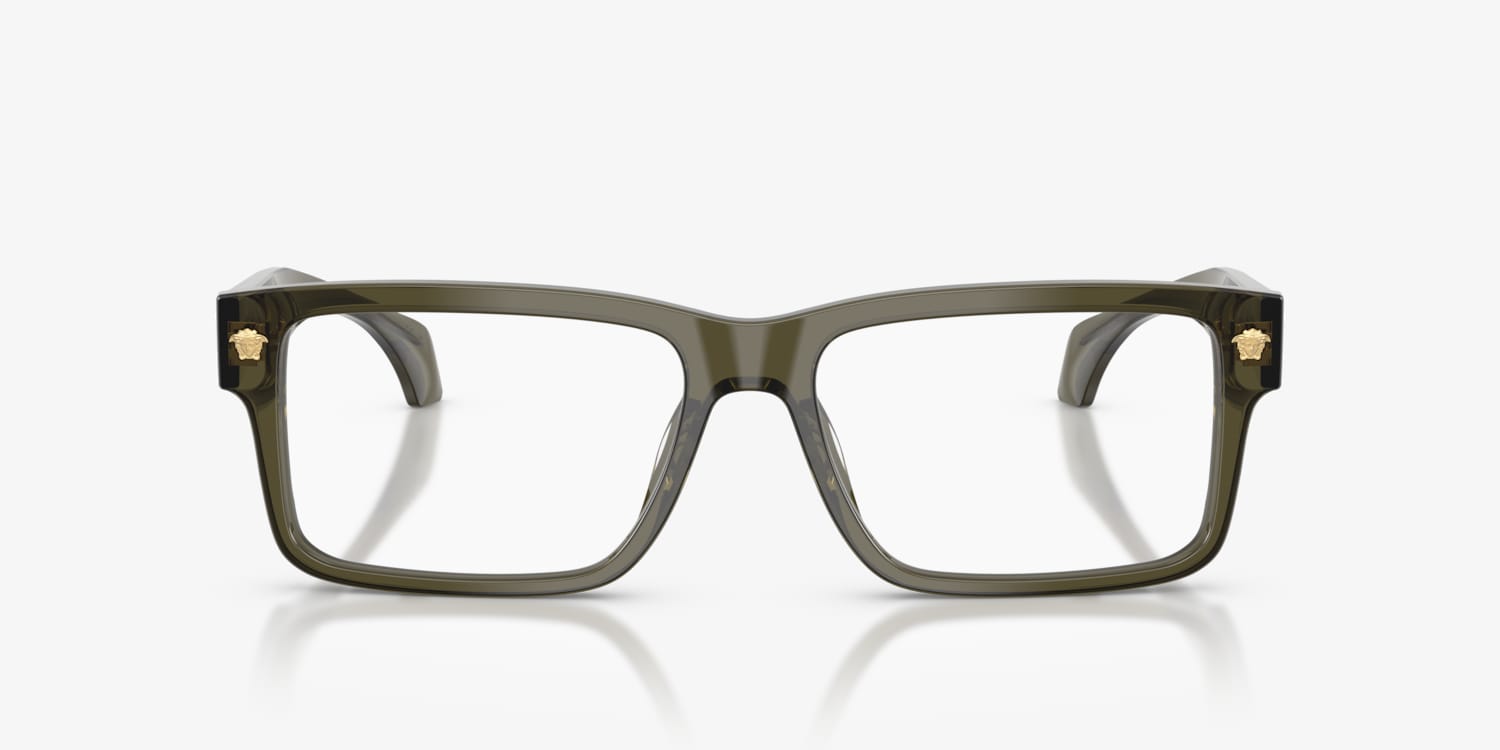 The Versace VE3391U optical glasses blend contemporary elegance with iconic design. Angular edges create a sleek, structured look, while the acetate frames in bold green glasses add a touch of modern sophistication. Complete with heritage Medusa decor, these Versace glasses exemplify luxury and refinement.