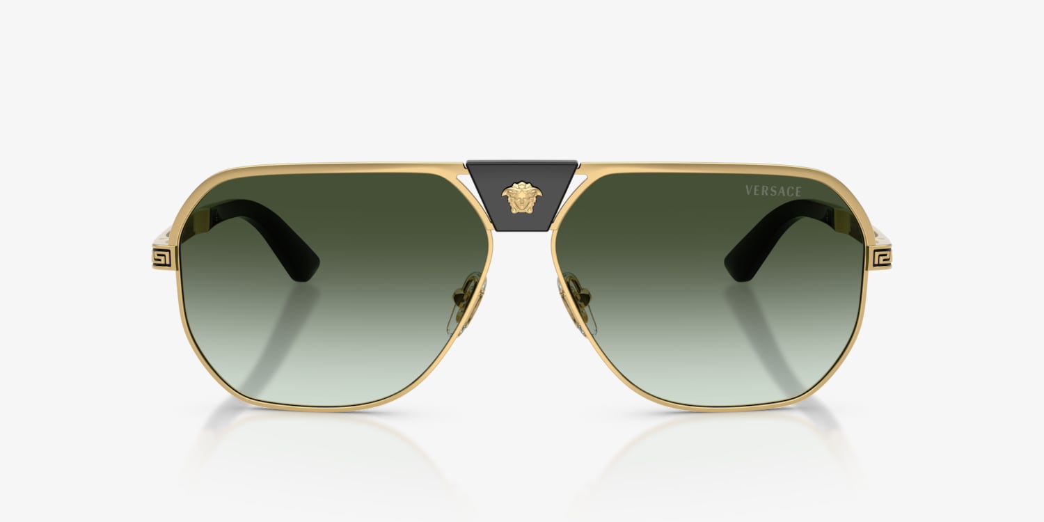 Elevate your style with the Versace VE2294 sunglasses. The square sunglasses, crafted from lightweight metal, feature bold geometric lines for a structured, modern look. The gold sunglasses offer a luxurious touch, while adjustable nosepads ensure a comfortable fit. Finished with green gradient lenses and iconic Medusa decor, these sunglasses embody powerful sophistication with unmistakable Versace heritage.