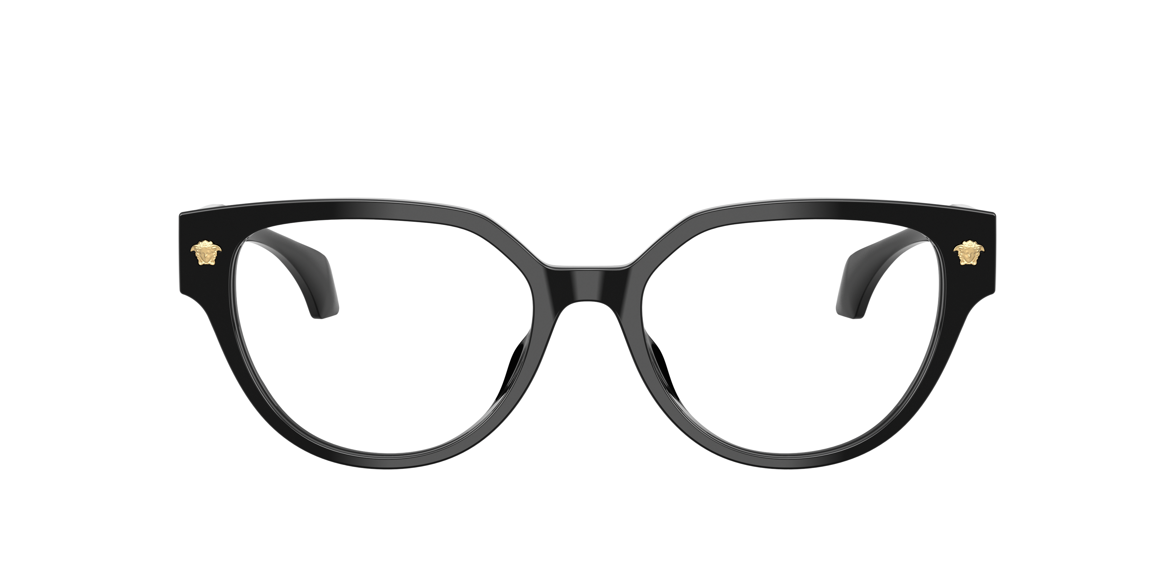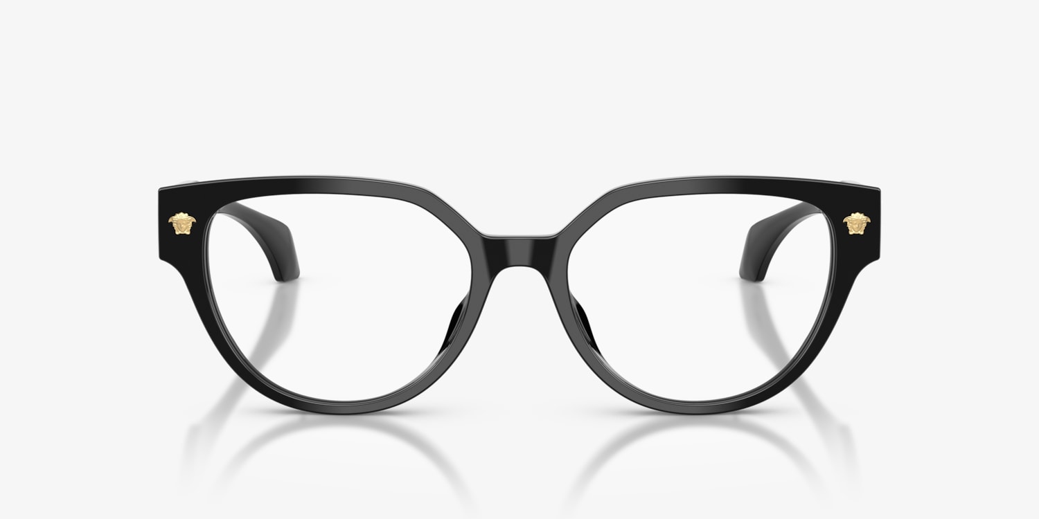 The Versace VE3394D optical glasses redefine bold sophistication with cat-eye black frames built from smooth acetate. A geometric bridge adds modern flair, while metal motifs enhance the design's signature edge. Featuring a slim construction and low bridge fit frames inspired by Asian design, this black colorway balances elegance with contemporary style.